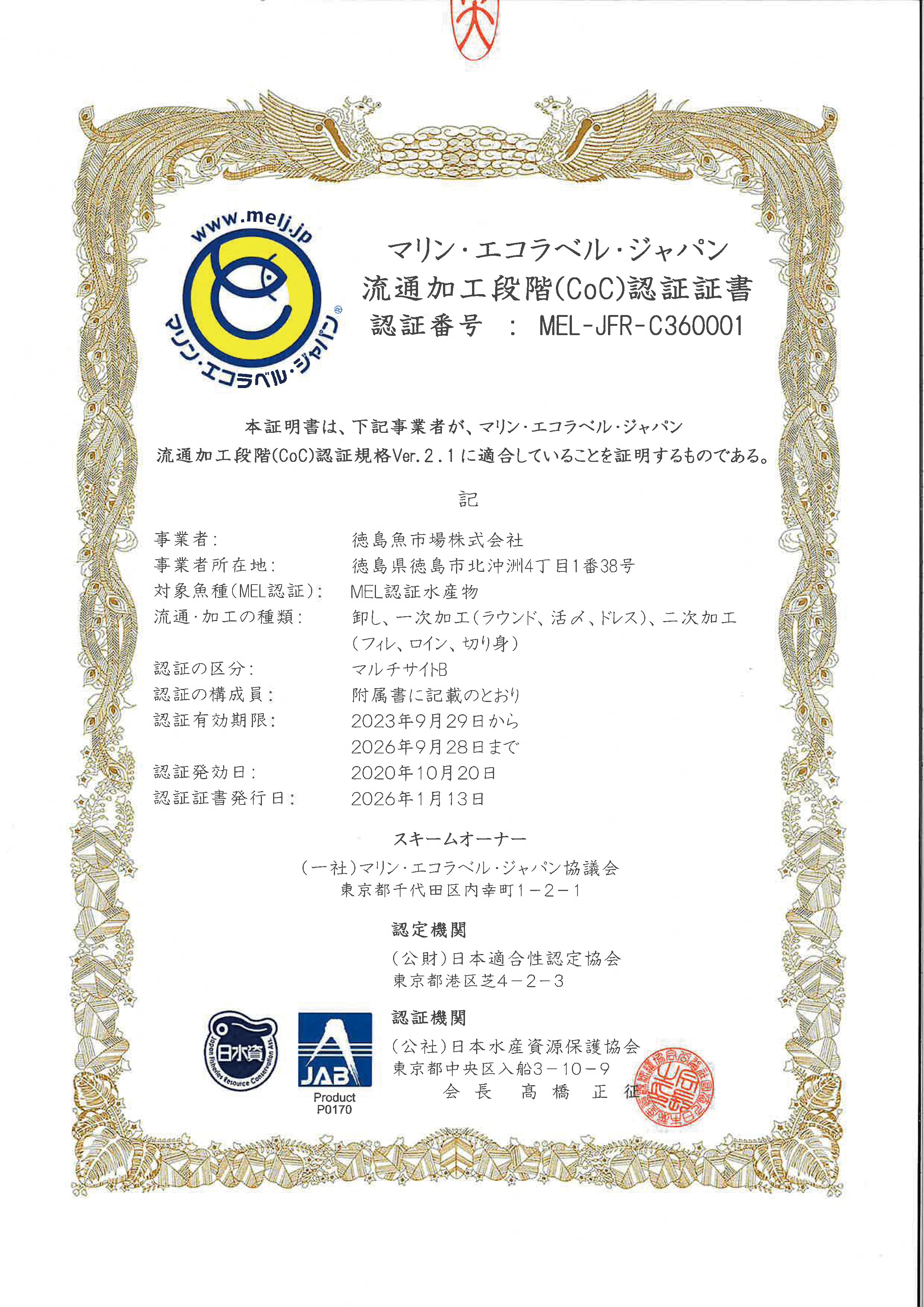 Tokushima Uoichiba has received the following certifications in recognition of its commitment to safe and secure aquaculture and environmentally friendly sustainable use of marine resources.
