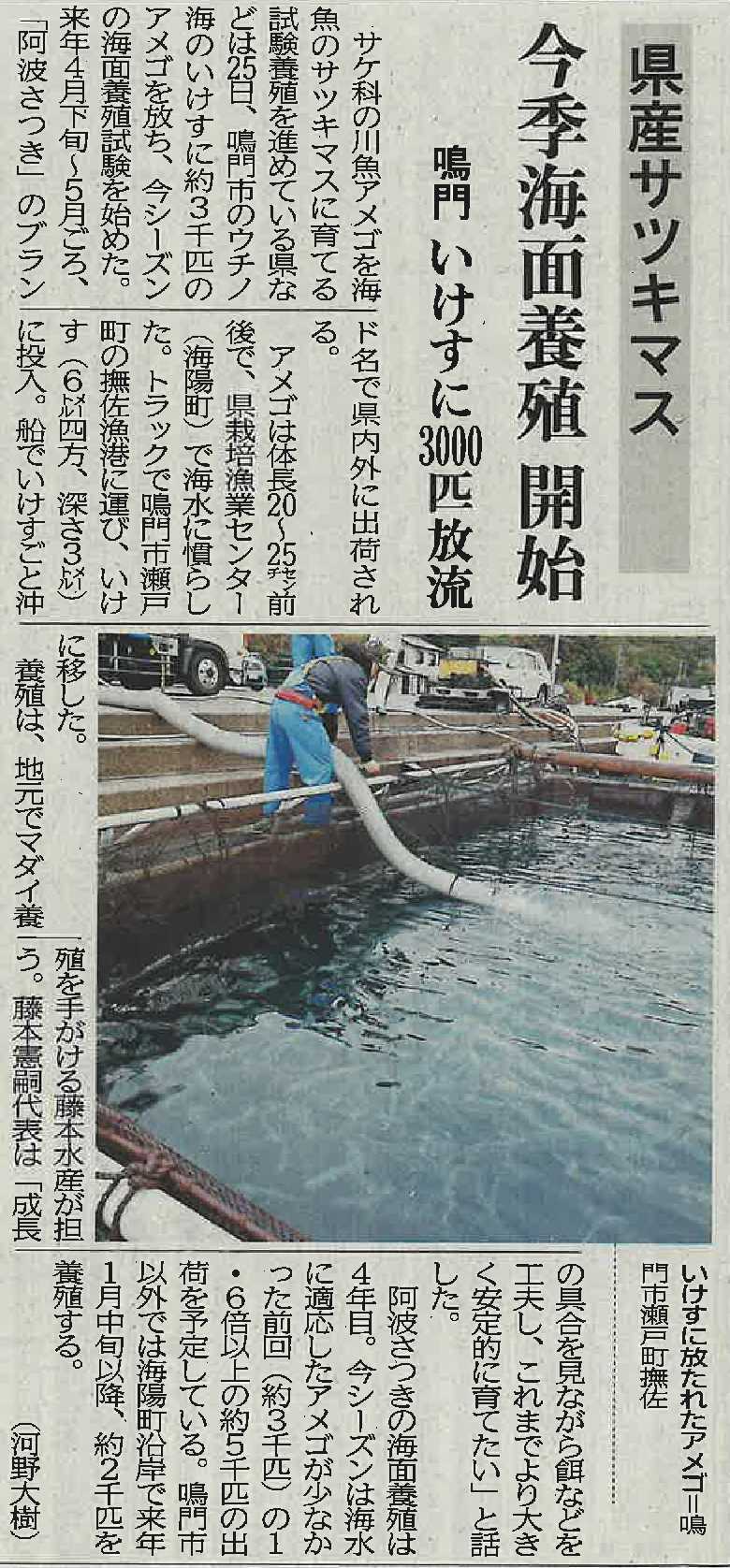 令和7年12月26日付の 徳島新聞 に、 「県産サツキマス 今季海面養殖開始」の記事が掲載されました。